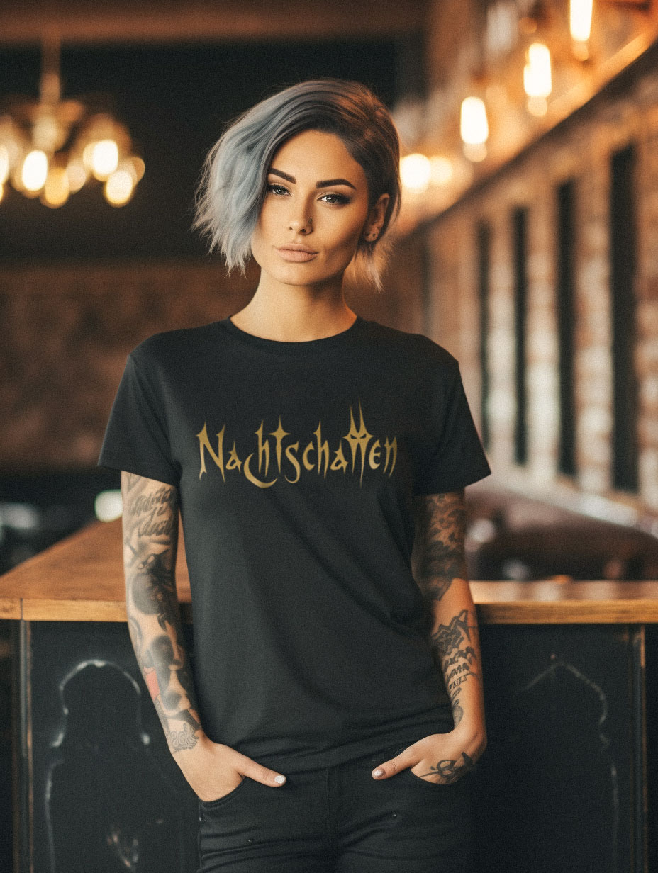 Schwarzes Lady fit Valueweight T-Shirt mit aufgedrucktem Nachtschatten Schriftzug in Messingoptik